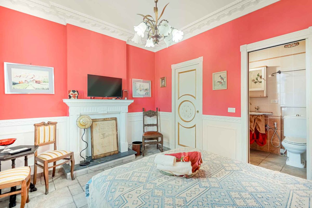 La nostra camera rossa è l’ideale per gli ospiti che cercano un ambiente ricco di passione e vitalità. Il suo intenso colore risveglia i sensi e dona energia, mentre l’antico armadio nella tua anticamera ti farà sentire subito a casa. L’arredamento è essenziale ma prezioso, con una testiera in foglia d’oro, uno splendido specchio . Nonostante le dimensioni contenute, il bagno con doccia è perfettamente funzionale e dotato di ogni comfort per garantirti un soggiorno piacevole e rilassante. Ti invitiamo a concederti un momento di relax nella nostra camera rossa, dove passione, comfort ed eleganza si fondono in un’esperienza unica.
